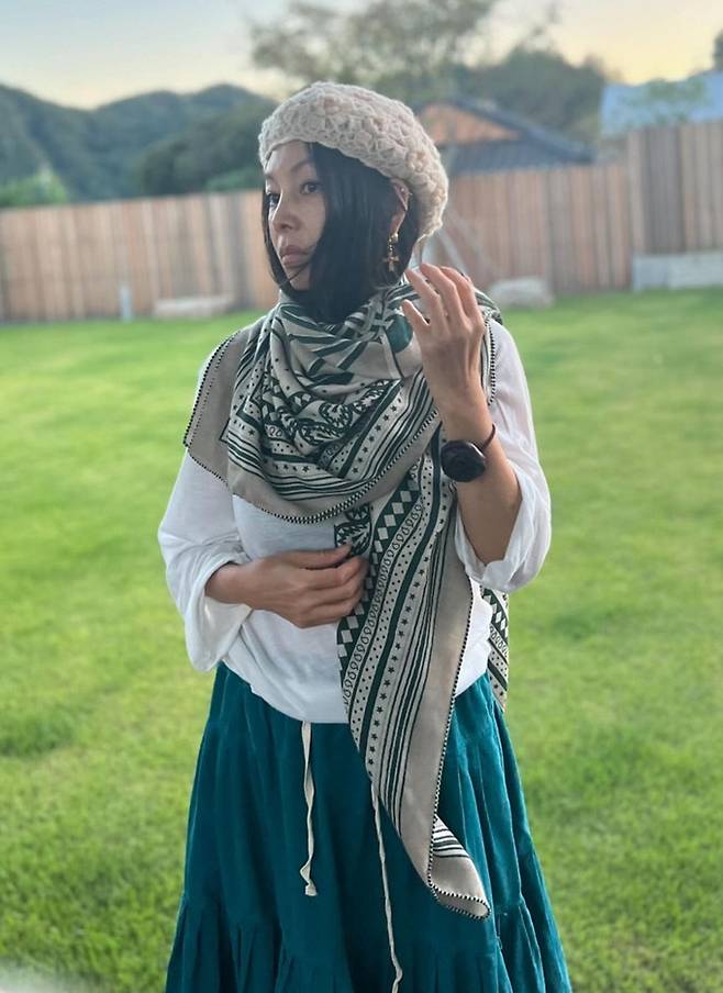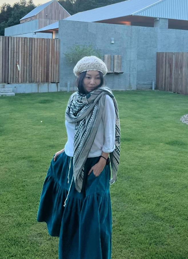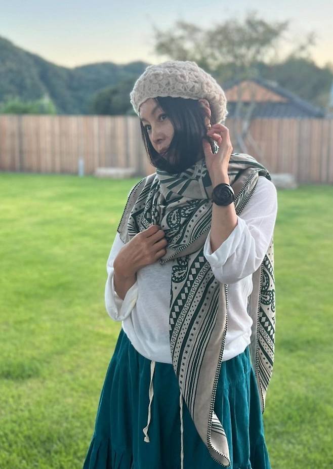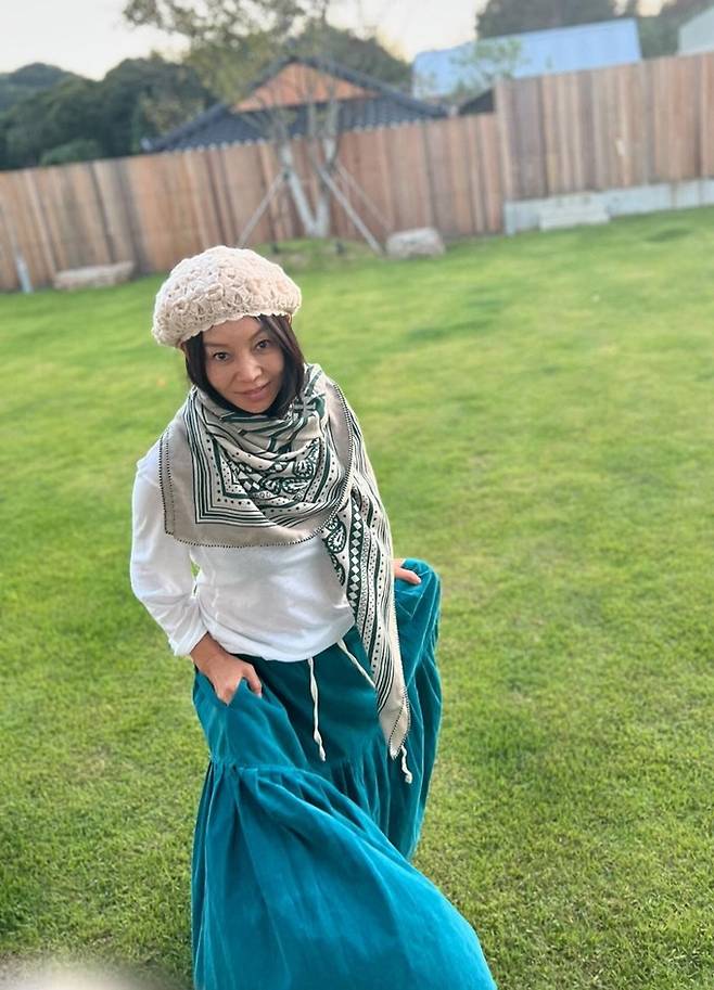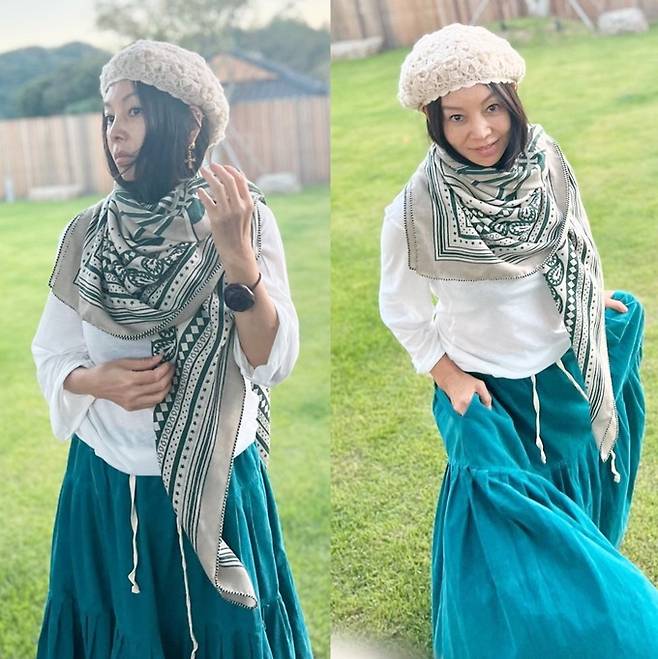 공개한 사진에서 황신혜는 블루 컬러의 롱 스커트에 화이트 긴팔 티셔츠를 입고 베이지 니트 베레모에 독특한 패턴의 초록 머플러를 두른 보헤미안 스타일의 가을룩으로 우아하면서도 멋스러운 패션 감각을 드러냈다.