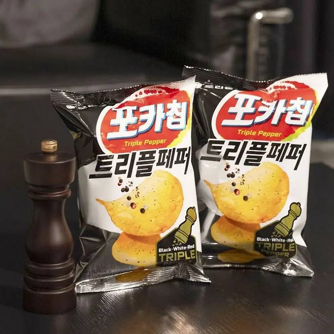 신상 포카칩이 등장했다. 블랙페퍼, 화이트페퍼, 레드페퍼가 모두 들어간 트리플페퍼. 세 가지 페퍼를 황금비율로 블렌딩했다. 블랙페퍼와 화이트페퍼가 알싸하고 묵직한 첫맛을 내고, 레드페퍼는 매콤하고 깔끔하게 마무리한다. 트러플이 아니고 트리플이니 주의.