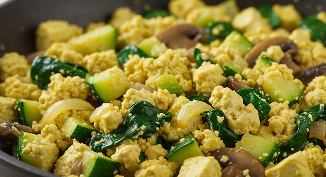 올리브 오일에 두부를 볶고 소금, 후추, 심황 가루로 간을 하면 맛있는 스크램블이 됩니다. 시금치, 양파, 호박, 버섯과 같은 채소를 함께 볶아 더 풍성한 한 끼를 만들 수 있습니다.