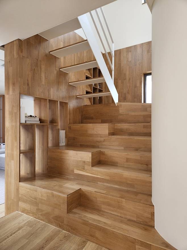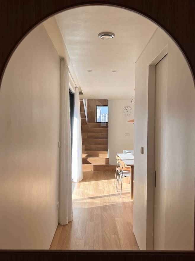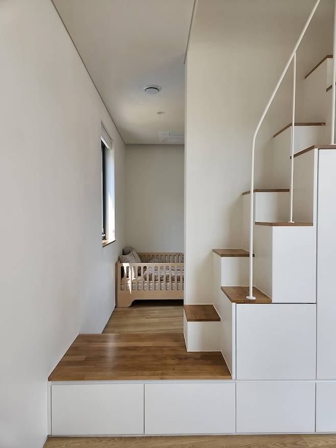 놀이방과 침실 사이에 다락 계단 가벽을 세웠어요. 복도 - 침실 - 놀이방 이 공간도 순환 구조로 설계했답니다.