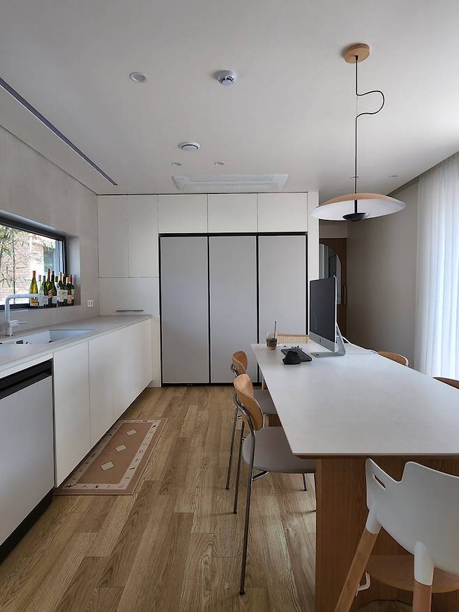 그리고 복도에 긴 책상을 제작해서 두었는데요, 아이와 셋이 앉기도 충분해서 좋아하는 공간 중 하나에요 :)