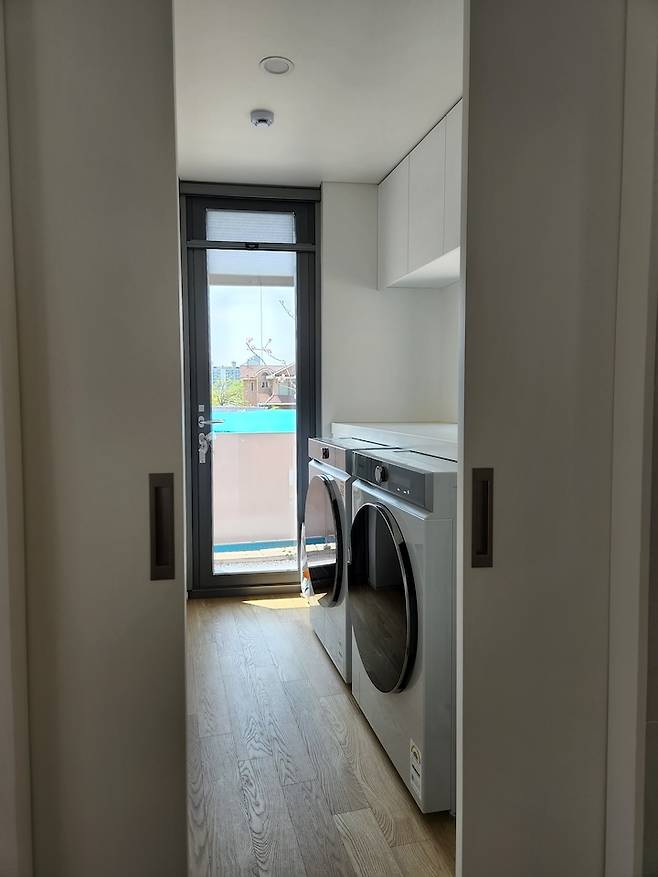 주방 옆으로는 다용도실 겸 세탁기가 있어요. 저희 집 실내에 모든 문은 미닫이로 되어있어요~ 여닫이로 할 경우 평수 및 공간 확보가 필요한 부분이어서 애초부터 미닫이로 하겠다 결정했었네요.