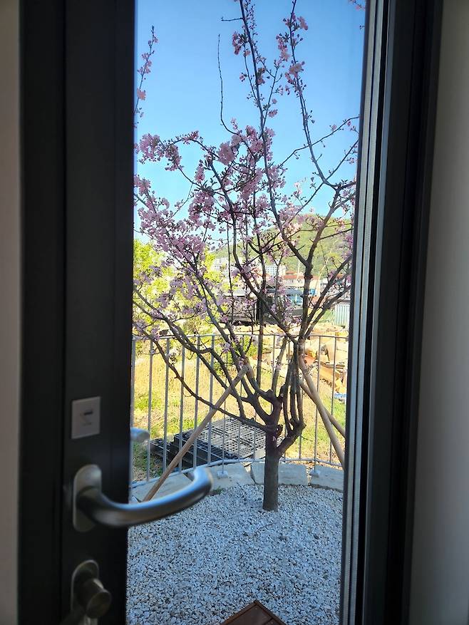 다용도실에서 야외로 나갈 수 있게 문을 설치하였고, 보통 음식물 쓰레기를 버리러 왔다 갔다 해요 ! 다용도실에서 보이는 벚나무도 예쁘네요 :)