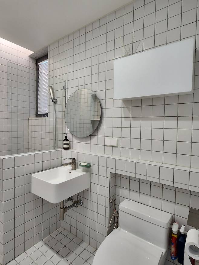 1층 욕실은 주로 손을 씻거나 손님용 욕실로 생각하고 인테리어 했어요. 거울에 간접조명을 설치할 계획으로 배선 작업을 진행하였고 배선 작업이 끝나고 제가 뒤늦게 거울을 작은 사이즈로 구매하는 바람에 배선을 가리기 위해 낮은 위치에 거울을 달게 되었네요. 욕실의 사용감이 적어 아직까진 깨끗하게 유지되고 있네요~ 수전 및 변기 청소 건은 니켈 제품입니다.
