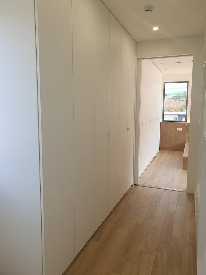 침실 옆 드레스룸은 붙박이장으로 제작해서 이불이나 의류 등을 보관하고 있어요. 복도와 침실 사이 이어지는 구조여서 실용적이고 또 편리하게 쓰고 있답니다.