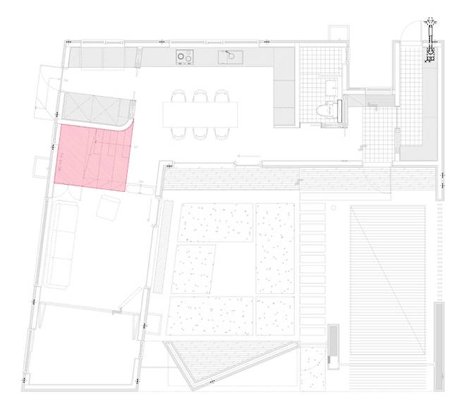 주방을 지나 계단&책장 옆으로 거실이 나옵니다. 거실에는 소파와 티비만 배치하고, 거실 옆으로는 평상이 있어요. 작은 방으로 별도 게스트룸을 마련할까 생각했으나 손님이 매일 오지 않는 이상 불필요한 공간일 수도 있겠다 싶더라고요. 버리는 공간 없이 평소에도 활용할 수 있었으면 해서 단차를 높여 시공했어요.