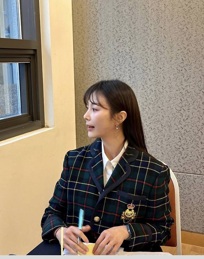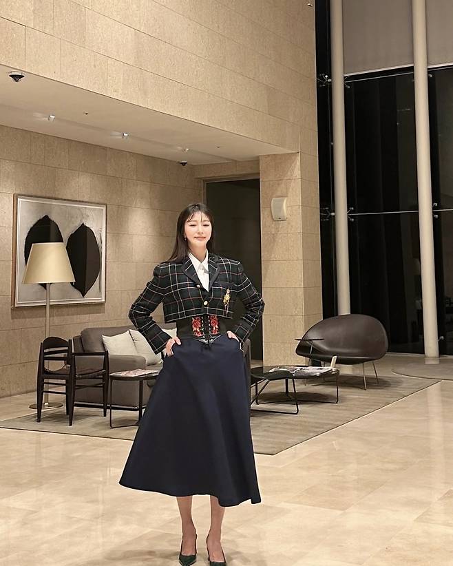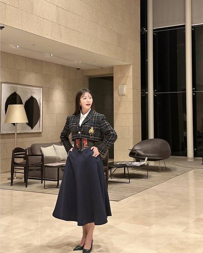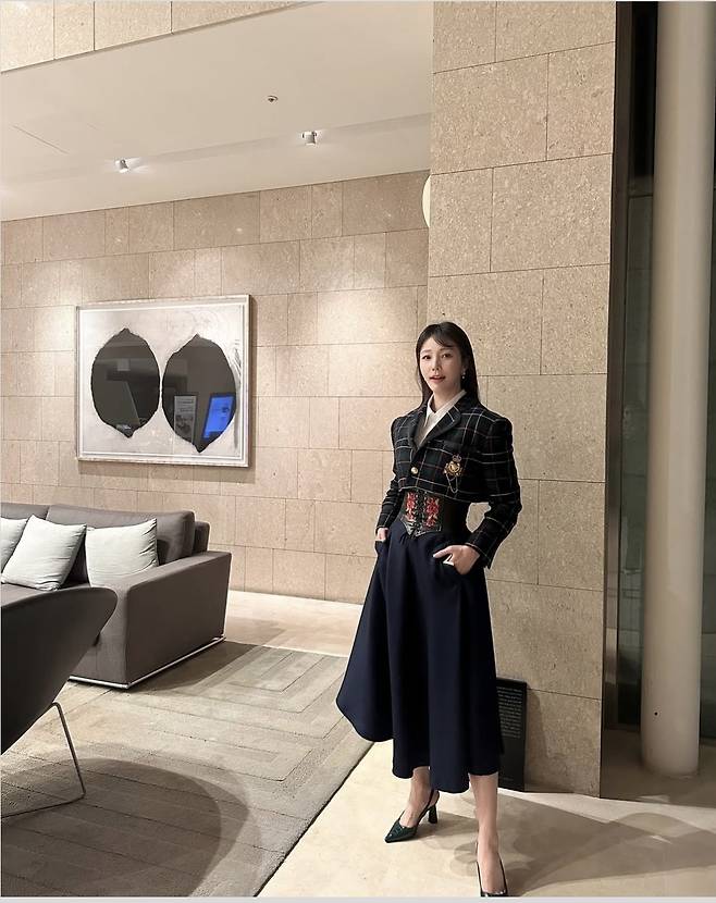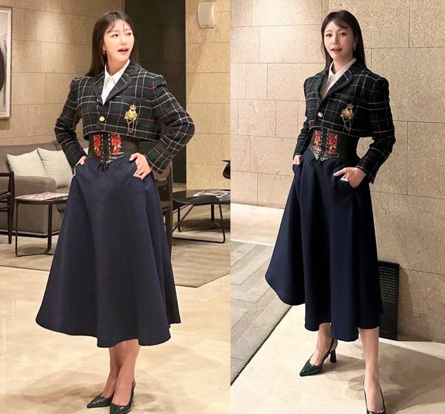 안혜경은 골드 버튼으로 포인트 블랙 그린 체크 패턴의 숏 재킷과 허리를 잡아주는 웨이스트라인을 강조한 자수 디테일의 코르셋 벨트로 고풍스러운 실루엣을 완성했습니다.
