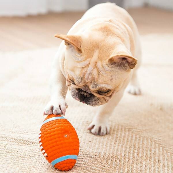 가벼운 럭비공 모양 장난감입니다. 라텍스 재질로 안전하고 튼튼해요. 럭비공 모양이라 튀는 방향을 예측할 수 없어 강아지가 더 재미있게 놀아요. 삑삑 소리도 나서 강아지 흥미를 끌기 좋습니다.