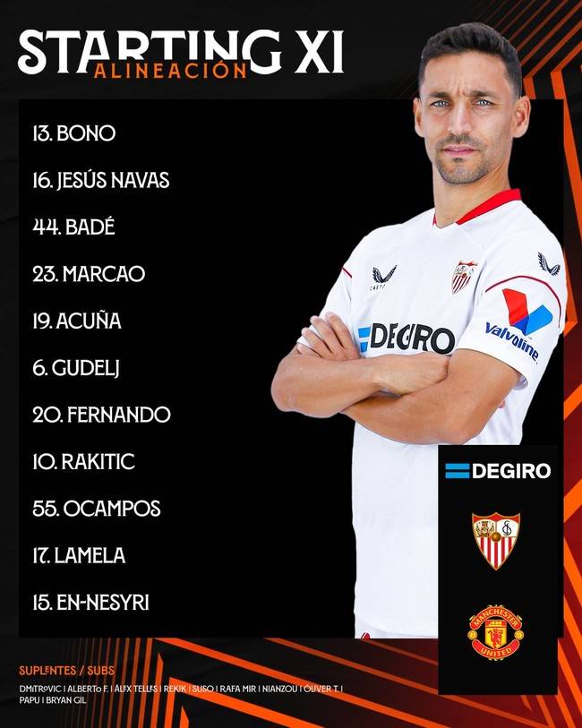 2차전 선발 라인업이 공개됐다. 홈팀 세비야는 4-2-3-1 포메이션을 내세운다. 엔 네시리, 라멜라, 라키티치, 오캄포스, 페르난두, 구델, 아쿠냐, 마르캉, 바데, 나바스, 부누가 출전한다.