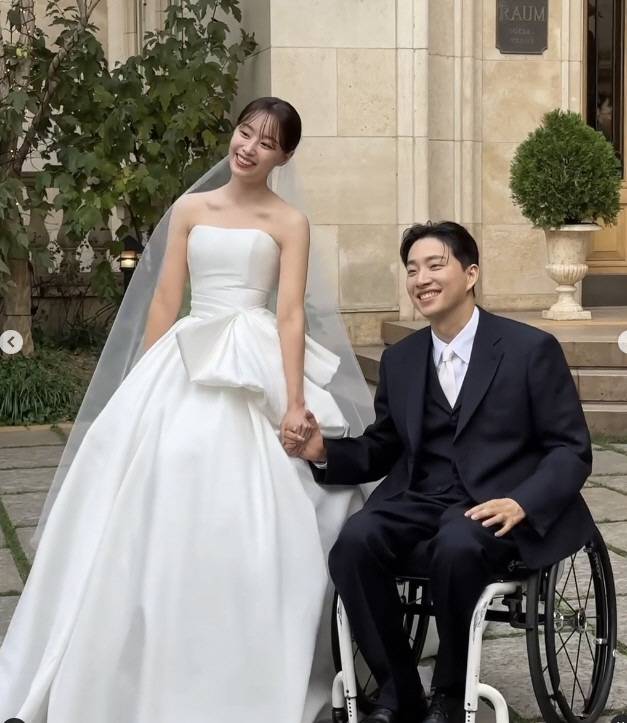 순백의 오프숄더 드레스를 입은 송지은은 남편 박위와 손을 꼭 잡고 행복한 결혼식을 올렸다.