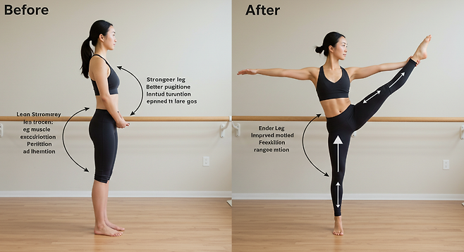 동작 설명: 한 손으로 바를 잡고, 반대쪽 다리를 천천히 뒤로 들어 올린다. 이때 상체를 약간 숙여 코어로 균형을 유지한다. 무릎은 곧게 펴고, 발끝을 길게 뻗는다. 팔은 부드럽게 앞으로 뻗어 균형을 유지한다.