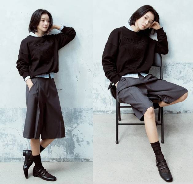 서예지는 블랙 스웻셔츠에 셔츠를 레이어드하고, 무릎 아래로 내려오는 그레이 컬러의 버뮤다팬츠를 매치해 깔끔하면서도 중성적인 매력을 완성했습니다.