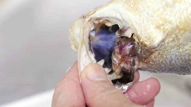 생선 비늘도 가위로 긁어가며 모두 제거해 주세요. 아가미 부분도 함께 제거하세요. 조기는 따로 내장을 제거하지 않았지만 다른 생선을 굽는 다면 내장을 제거한 후에 굽는 것이 좋아요.
