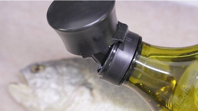 여기에 생선이 맛있게 구워지도록 식용유를 조금 둘러 주세요. 그리고 생선에 골고루 펴서 발라 주시면 된답니다.