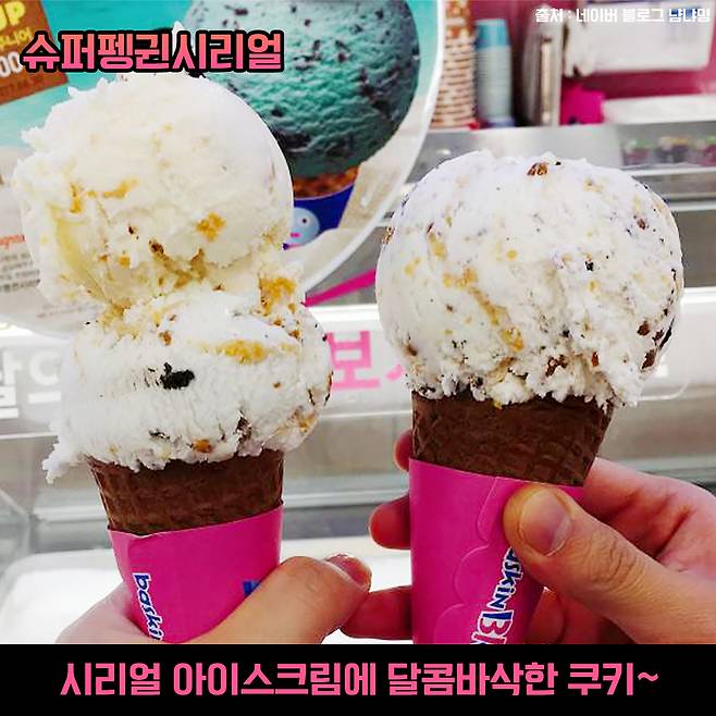 시리얼 아이스크림에 달콤바삭한 시리얼과 쿠키가 들어가 있는 슈퍼펭귄시리얼! 이때 배스킨라빈스 신메뉴가 JMT라고 소문이 났었는데 말이죠.