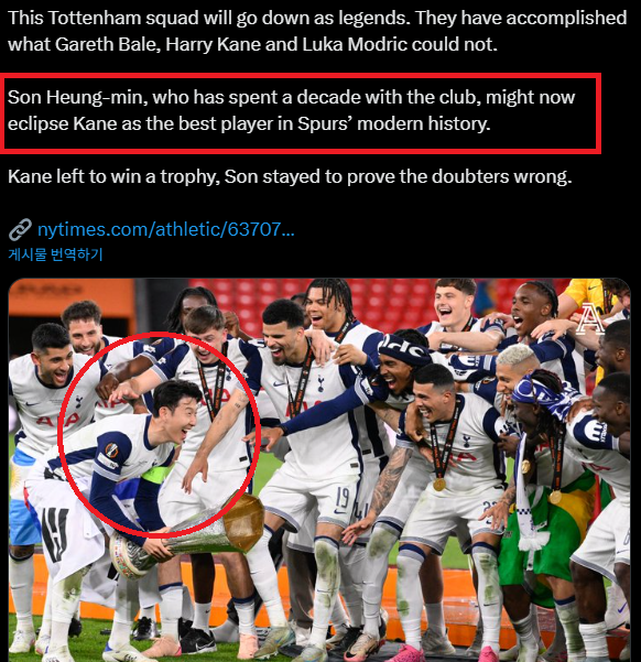SNS에서는 태극기를 두르고 트로피를 든 손흥민의 모습이 빠르게 확산됐으며, ‘He stayed. He believed. He did it(그는 남았다, 믿었다, 결국 해냈다)’ 라는 문구가 해외 커뮤니티에서 반복 공유됐다. 이로써 손흥민은 토트넘에서 유럽 우승을 이끈 최초의 아시아 선수가 되었고, 선수 생활 황혼기에 커리어의 가장 큰 트로피를 획득했다는 점에서 더 큰 감동을 주고 있다.