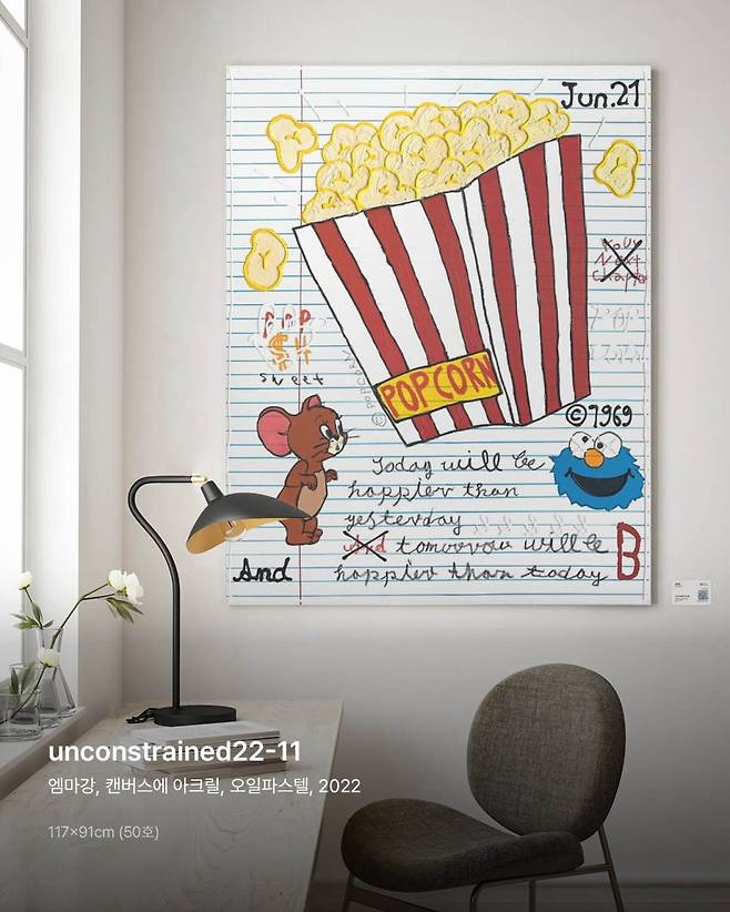 어떠한 틀과 형식에도 얽매이지 않고 자유롭게 작품활동을 하고싶으시다는 엠마강 작가님의 작품입니다. 좋아하는 단어와 캐릭터들이 자유롭게 표현되어 있는데요, 자유분방한 작품처럼, 감상하시며 새로운 상상과 생각의 매개체를 만들어 보세요.