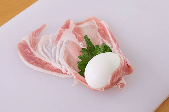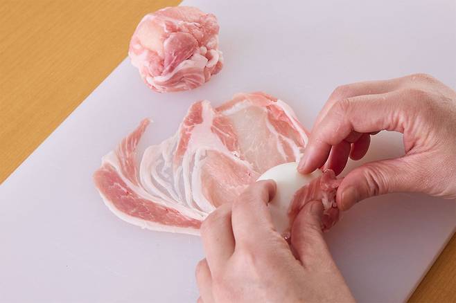 2. 돼지고기 얇은 고기로 달걀을 감싸 동그랗게 만든다.