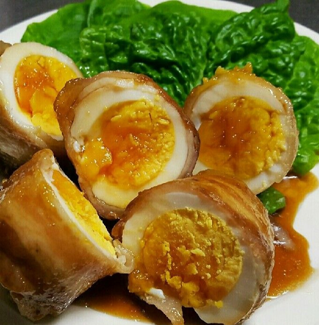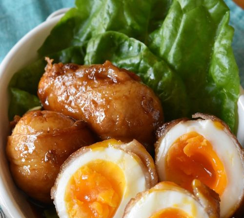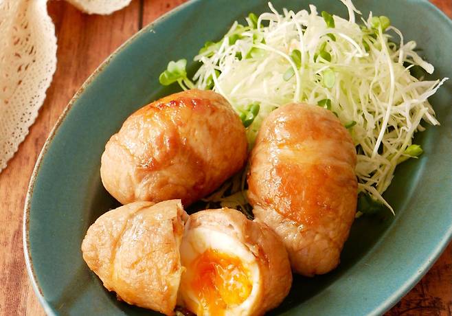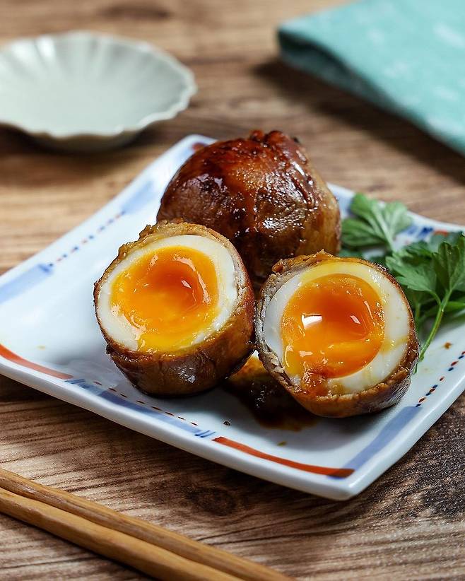 반숙 계란은 삶는 시간이 중요하다. 6분 삶은 뒤 곧바로 찬물에 담가야 껍질이 잘 벗겨지고 속이 촉촉하게 유지된다. 돼지고기는 얇게 썰린 부위를 사용해야 달걀을 고르게 감쌀 수 있다.