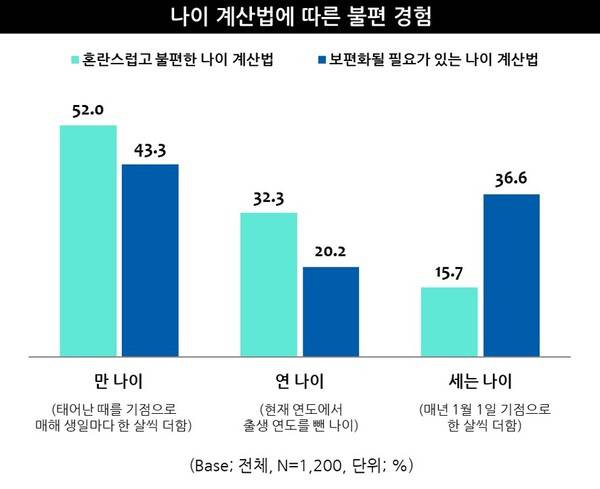시장조사전문기업 엠브레인 트렌드모니터가 전국 만 13~69세 남녀 1,200명을 대상으로 ‘2024 만 나이 통일 정책 관련 인식 조사’를 실시한 결과, ‘만 나이 통일’ 정책 시행 이후에도 나이 계산법 혼용으로 불편함을 느끼는 사람들이 많은 것으로 나타났다.