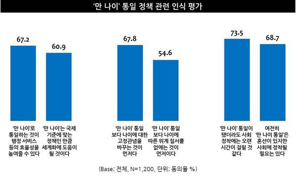 단, 주요 연령대에서 ‘만 나이 통일’ 정책의 찬성 비율이 소폭 감소한 결과를 보인 점은 주목할 만한 대목이었다(10대 27.5%, 20대 66.4% → 49.5%, 30대 67.2% → 57.5%, 40대 61.2% → 54.0%, 50대 66.0% → 59.0%, 60대 78.5%). ‘만 나이 통일’ 정책이 제도적으로는 타당성을 인정받고 있지만, 일상생활에서 실질적 이점이 충분히 전달되지 못한 결과로 해석해 볼 수 있었다.