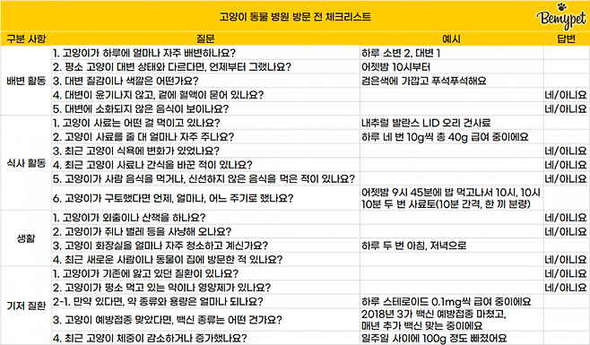 동물 병원 방문 전 체크리스트를 확인하면, 고양이의 상태를 빠르게 확인할 수 있고 필요한 검사만 할 수 있어 좋답니다.