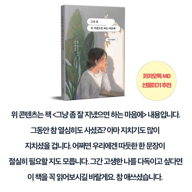 늘 스스로를 챙기는 사람이 되길 바라겠습니다. 이 콘텐츠는 책 <그냥 좀 잘 지냈으면 하는 마음에>를 바탕으로 제작된 콘텐츠입니다.