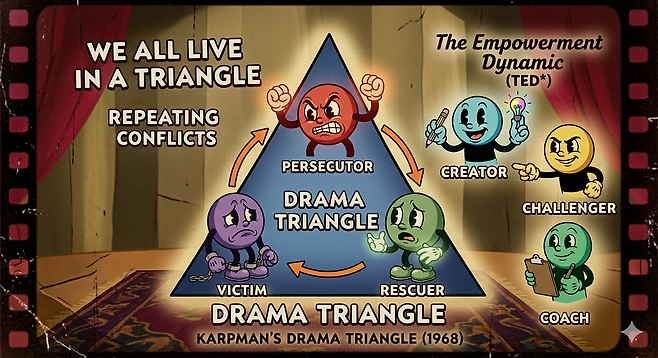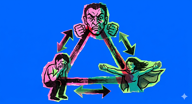 카프만은 1968년, 갈등 상황 속에서 사람들이 반복적으로 취하게 되는 세 가지 역할을 하나의 구조로 설명했다. 피해자(Victim), 가해자(Persecutor), 그리고 해결사(Rescuer). 그는 이것을 ’드라마 삼각형(Drama Triangle)’이라고 불렀다. 삼각형이라는 이름이 붙은 이유가 있다. 이 세 역할은 서로를 필요로 한다. 피해자는 가해자와 해결사 없이 존재하지 못하고, 해결사는 피해자 없이 자신의 역할을 증명할 수 없다. 가해자 역시 마찬가지다. 이 삼각형은 구조 자체가 갈등을 ‘해결’하는 게 아니라 ‘유지’하도록 설계되어 있다.