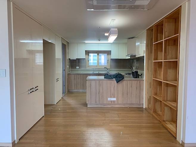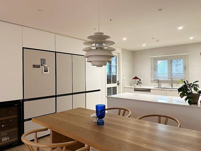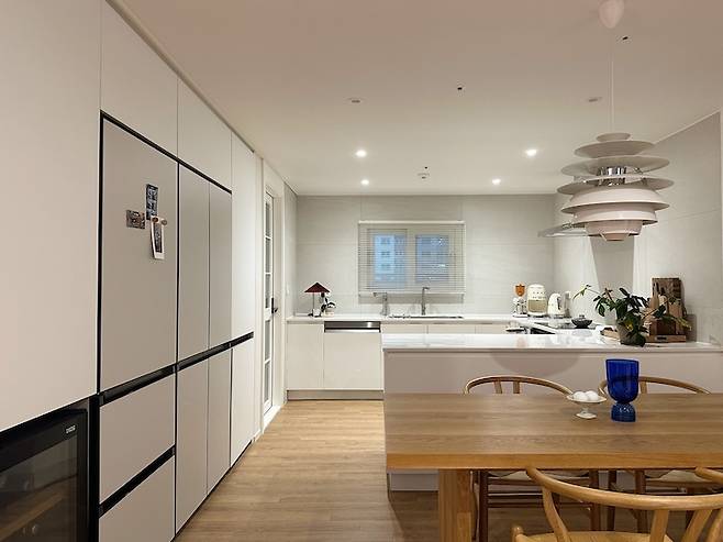 기존에 수납장과 상부장이 있는 상태에선 4인용 테이블 정도만 놓을 수 있는 공간이었는데, 튀어나온 수납장과 상부장을 철거하고 나니 그 이상 사이즈의 테이블을 놓을 수 있는 공간이 생겨 여유 공간 맞춰 주문 제작을 진행했어요.