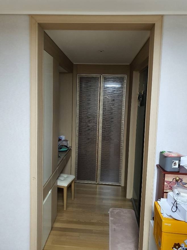 침실 문 전면에는 붙박이장이 있었어요. 붙박이장 상태가 좋아 드레스룸으로 사용할 작은방으로 이동시키고 침실은 큰 침대를 위해 비워냈어요.