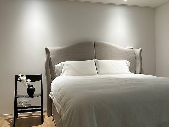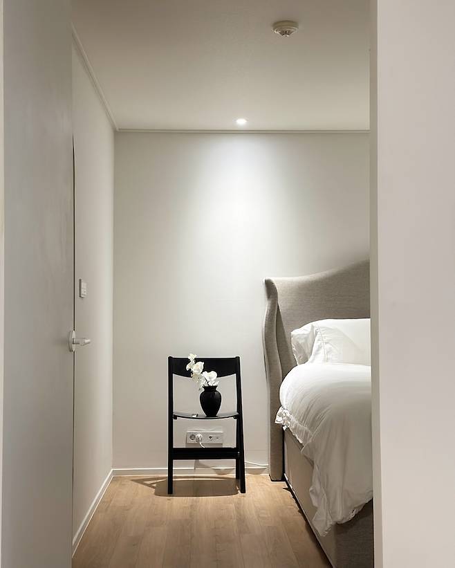 침실은 침대 외에 아무 가구 없이 생활하고 있어요. 맘에 드는 머릿장을 찾지 못해 이케아에서 산 손님용 간이 의자에 핸드폰 등을 올려두고 임시로(2년간) 사용하고 있는데요, 올해는 안방에 놓을 맘에 드는 머릿장과 수납장을 꼭 찾았으면 하는 바람이에요.