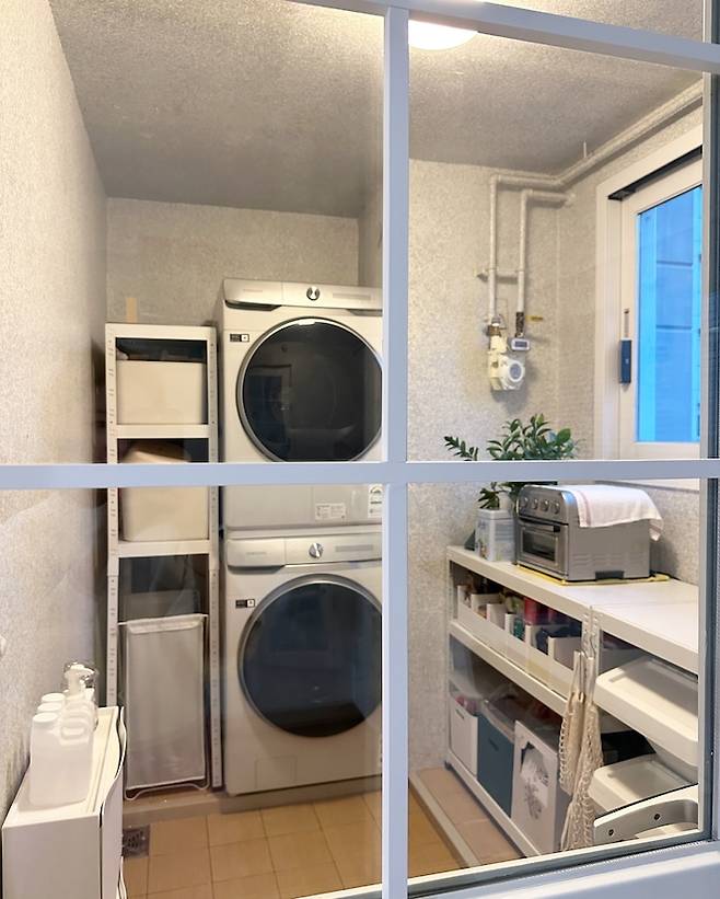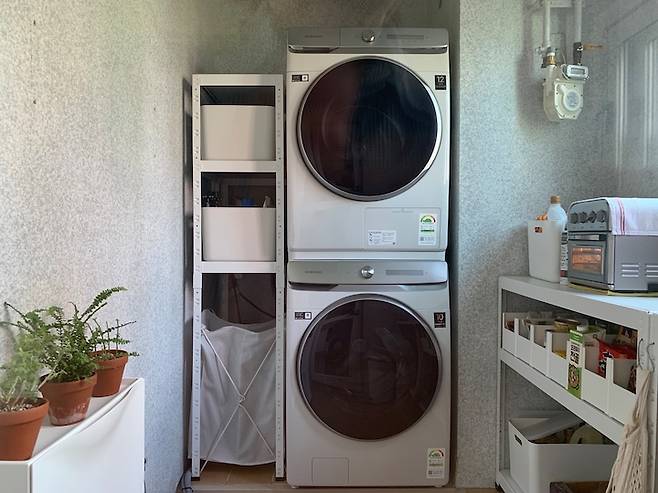 주방 터닝 도어 안쪽의 세탁실은 조립식 장으로 작은 팬트리 공간을 마련했어요. 세탁기와 건조기 왼쪽으로는 빨래함과 세탁 및 청소용 세제를 놓는 공간이며, 오른쪽은 온도에 민감하지 않은 식료품과 에어프라이어를 놓고 사용하고 있어요.