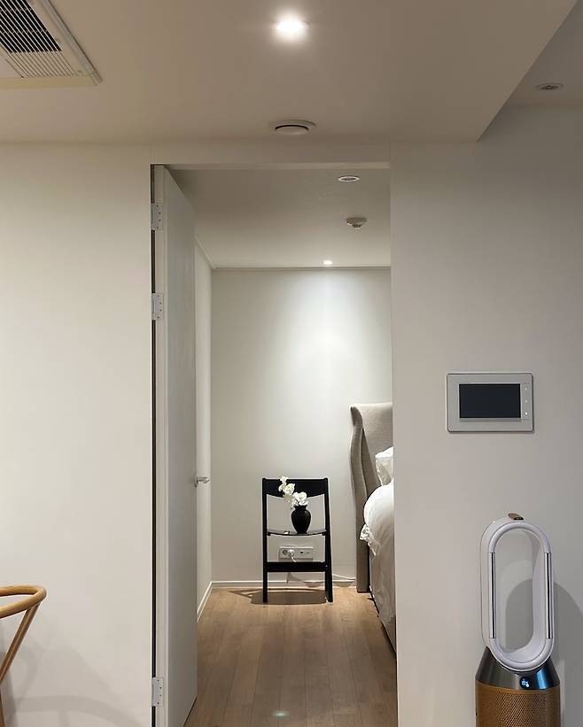 파우더룸 안쪽 공간에서 바라본 침실 공간으로 침실 한쪽의 허전함을 식물들이 채워주고 있어요.