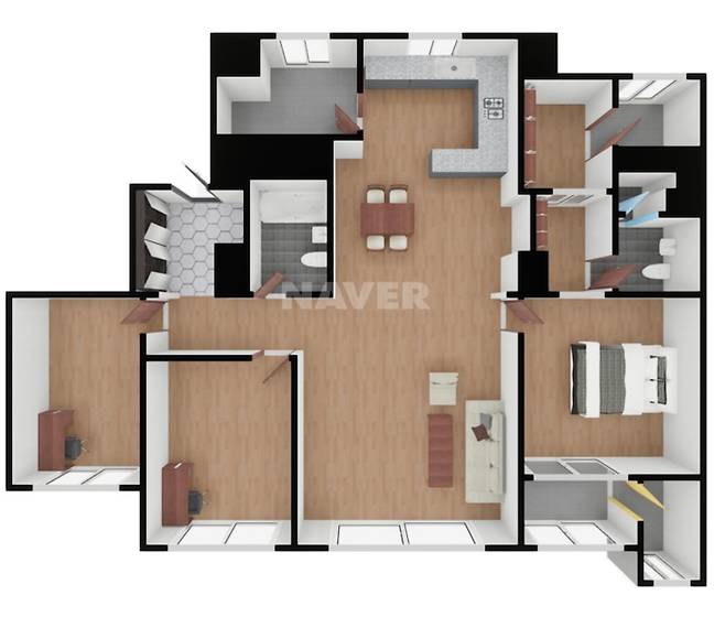 사진은 확장형 도면으로 주방과 안방을 제외한 발코니는 이미 확장되어 있었어요. 입주한 지 5년 된 준신축 아파트이고 확장도 되어 있었기 때문에 처음 계획은 도배와 마루, 공용 욕실 정도의 부분 수리였어요.