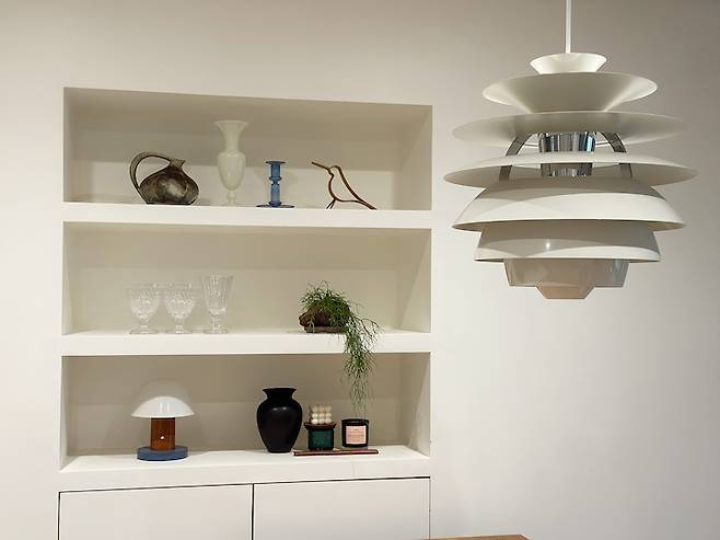 기존 수납장 뒤로 철거가 불가한 콘크리트 벽이 있어 매립 형태의 수납공간을 제작해 잔과 오브제들을 올려두는 장식장으로 사용하고 있는데요. 이제 와서 보니 이 공간 대부분이 가족과 지인들의 선물로 채워져 있네요.