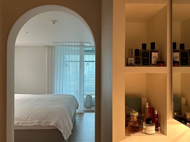 거울 왼편 기존에 있던 오픈형 수납장에는 자주 사용하는 향수와 에어랩 등을 놓고 사용하고 있어요.