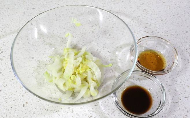 ▶물이 끓어오르면 배춧잎을 넣고 3분 정도 데친 후 찬물에 씻어 물기를 꼭 짜줍니다