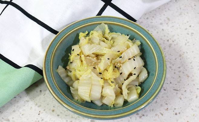 ▶먹기좋은 크기로 썰어준 뒤 국간장 한스푼, 참기름 한스푼, 깨를 넣고 조물조물 무쳐줍니다.