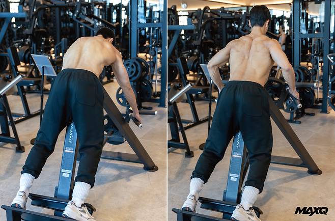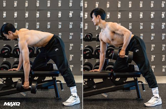 “허리가 둥글게 말린 상태에서 덤벨을 당기면 타깃 부위가 달라지고, 허리 부상을 일으킬 수 있으므로 주의하세요.”