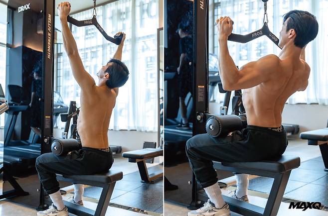 맥그립으로 랫 풀다운을 하면 손목과 어깨에 주어지는 부담이 줄고, 보다 쉽게 최대 수축을 할 수 있다. 머신에 앉아 패드에 허벅지를 고정한다. 팔꿈치가 몸통 앞에 오도록 맥그립을 당긴다. 광배근에 자극을 느끼며 천천히 준비자세로 돌아온다.