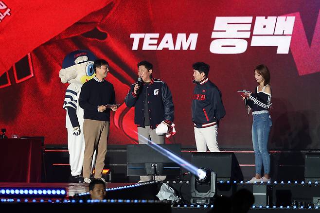 행사 직전 교육리그 연수를 가있는 이민석, 정현수 선수와 프리미어 12에 참가한 윤동희, 나승엽 선수는 영상으로 팬들과 먼저 인사를 나눴습니다.