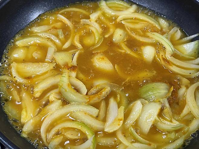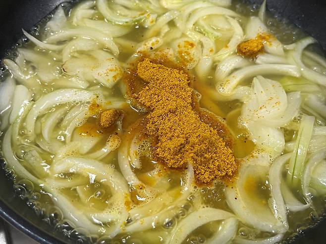 양파가 투명하게 익기 시작하면 양파가 잠길 정도로 물을 붓고 카레 가루 3~4 스푼 넣어 주세요. 카레 가루의 양은 일단 조금 넣고 나중에 간을 보고 추가하셔도 됩니다.
