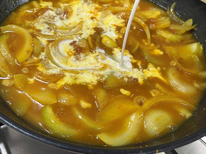 점도가 생겼으면 우유 50ml를 카레에 부어주세요. 우유가 들어가면 카레의 텁텁함이 사라지고, 고소하면서도 크리미 한 풍미가 더해집니다.