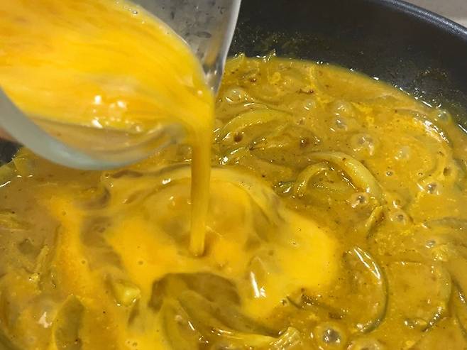 계란을 2개 풀어서 준비한 다음 카레에 부어 줍니다. 계란을 붓고 나서 절대로 휘젓지 마시고 계란이 자연스럽게 굳을 때까지 그대로 두세요. 바로 섞어버리면 계란이 퍼져서 카레 맛이 탁해지고 계란 식감도 잘 느낄 수가 없습니다.