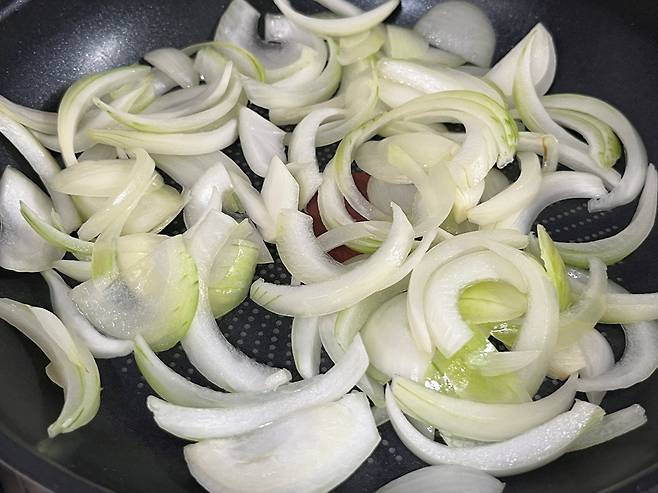 채 썬 양파는 기름 살짝 두르고 투명해질 때까지 볶아 주세요. 이 카레는 계란이 주인공이기 때문에 야채는 양파만 넣어도 충분합니다.