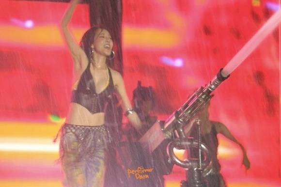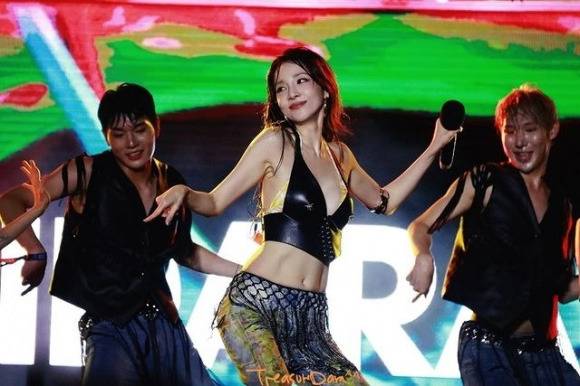 공개된 사진 속 산다라박은 가슴이 시원하게 파인 브라탑에 화려한 디자인의 바지를 입고 무대 위에서 역동적인 에너지를 분출했다.