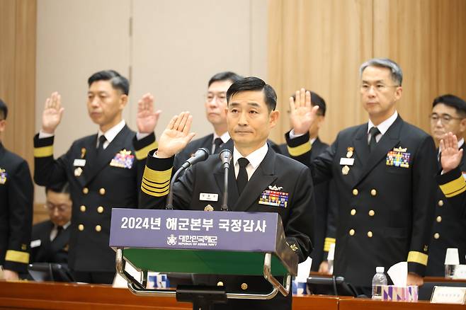 | ▲ 양용모 해군참모총장 등이 2024년 10월 18일 충남 계룡대 해군본부에서 열린 국회 국방위원회 해군 국정감사에서 선서하고 있다. |