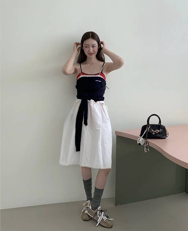 네이비 톱에 레드 포인트 라인이 들어간 슬리브리스 원피스에 블랙 리본을 허리에 묶어 포인트를 준 스타일링은 사랑스럽고도 경쾌한 무드를 자아냈습니다.