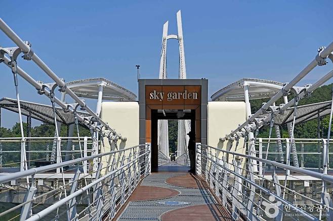 국내 최장 규모의 출렁다리 위에서 탁 트인 호수와 함께 스릴과 낭만을 동시에 느낄 수 있는 탑정호 출렁다리.