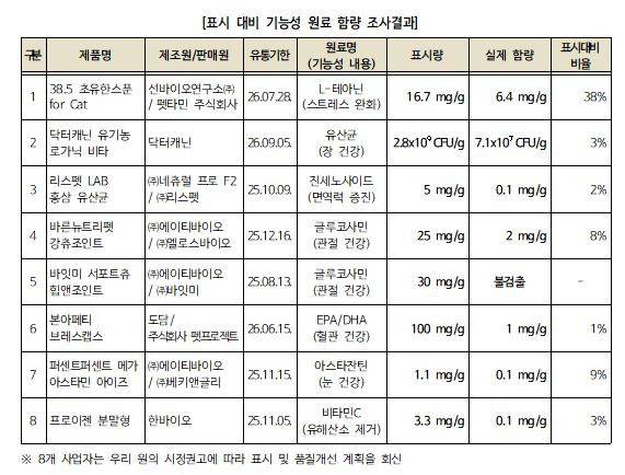 또 '38.5 초유한스푼 포 캣', '닥터캐닌 유기농로가닉 비타', '리스펫 LAB 홍삼 유산균', '바른뉴트리펫 강츄조인트', '본아페티 브레스캡스', '퍼센트퍼센트 메가 아스타민 아이즈', '프로이젠 분말형' 등 7개 제품은 기능성 원료 함량이 표시된 양의 1∼38% 수준에 불과했다.